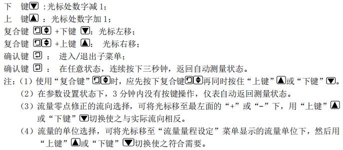 顯示中:上行“基準(zhǔn)”代表儀表零點的測量值,下行顯示是流量零點修正值。當(dāng)“基準(zhǔn)”顯示不為“0”時,應(yīng)調(diào)修正值使基準(zhǔn)=0。注意:若改變下行修正值,“基準(zhǔn)”值增加,需要改變下行數(shù)值的正、負號,使“基準(zhǔn)”能夠修正為零。